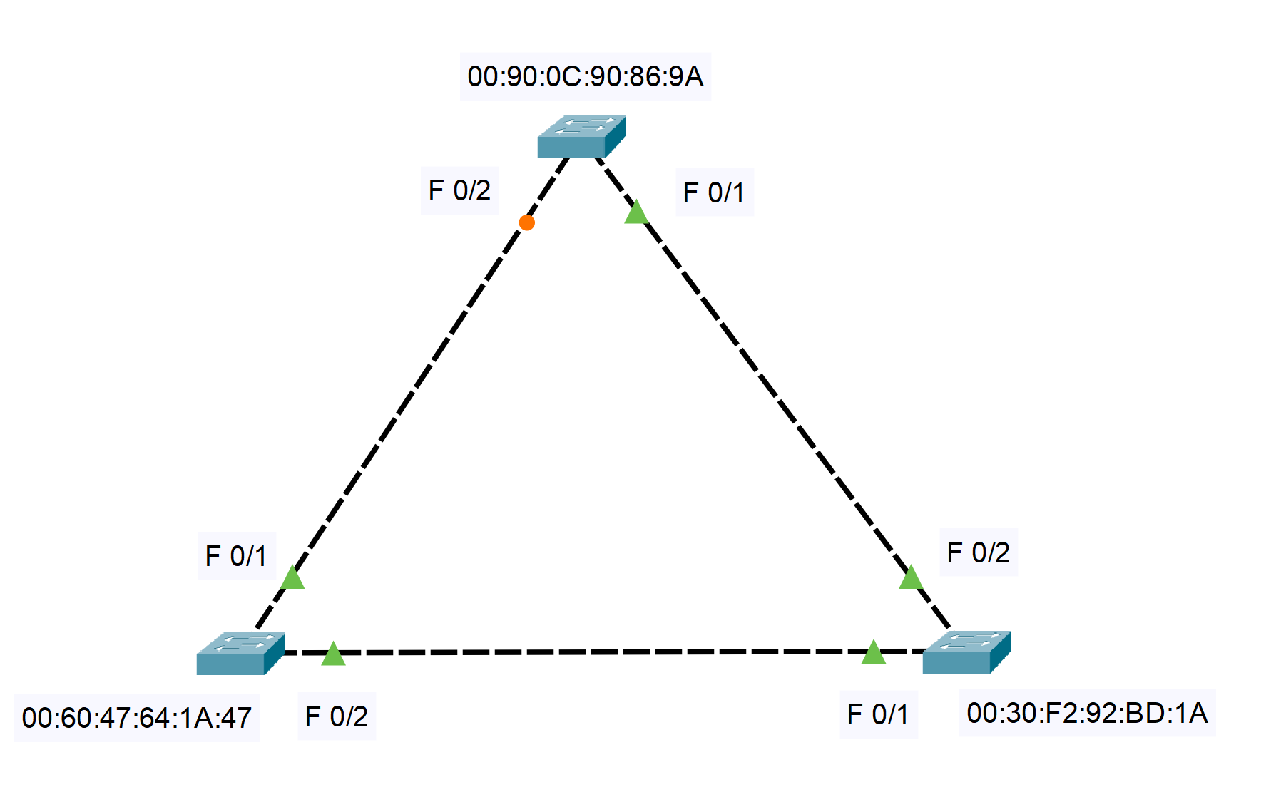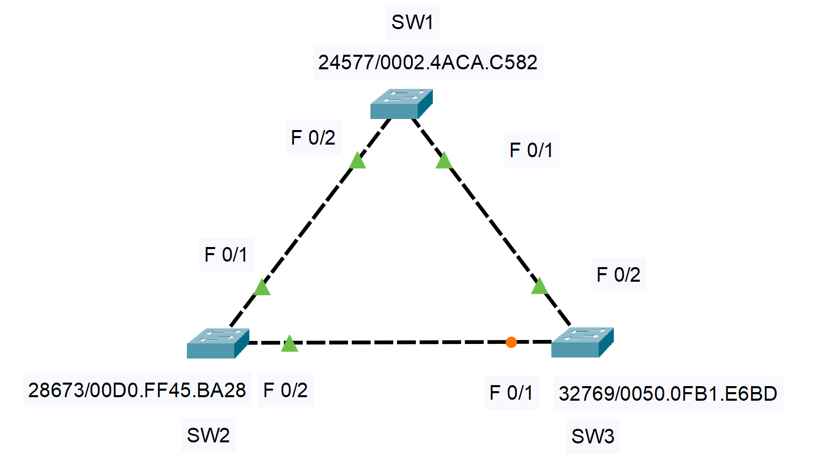 1. 按图连接交换机:SW1 F0/2 ↔︎ SW2 F0/1, SW2 F0/2 ↔︎ SW3 F0/1, SW3 F0/2 ↔︎ SW1 F0/1。
