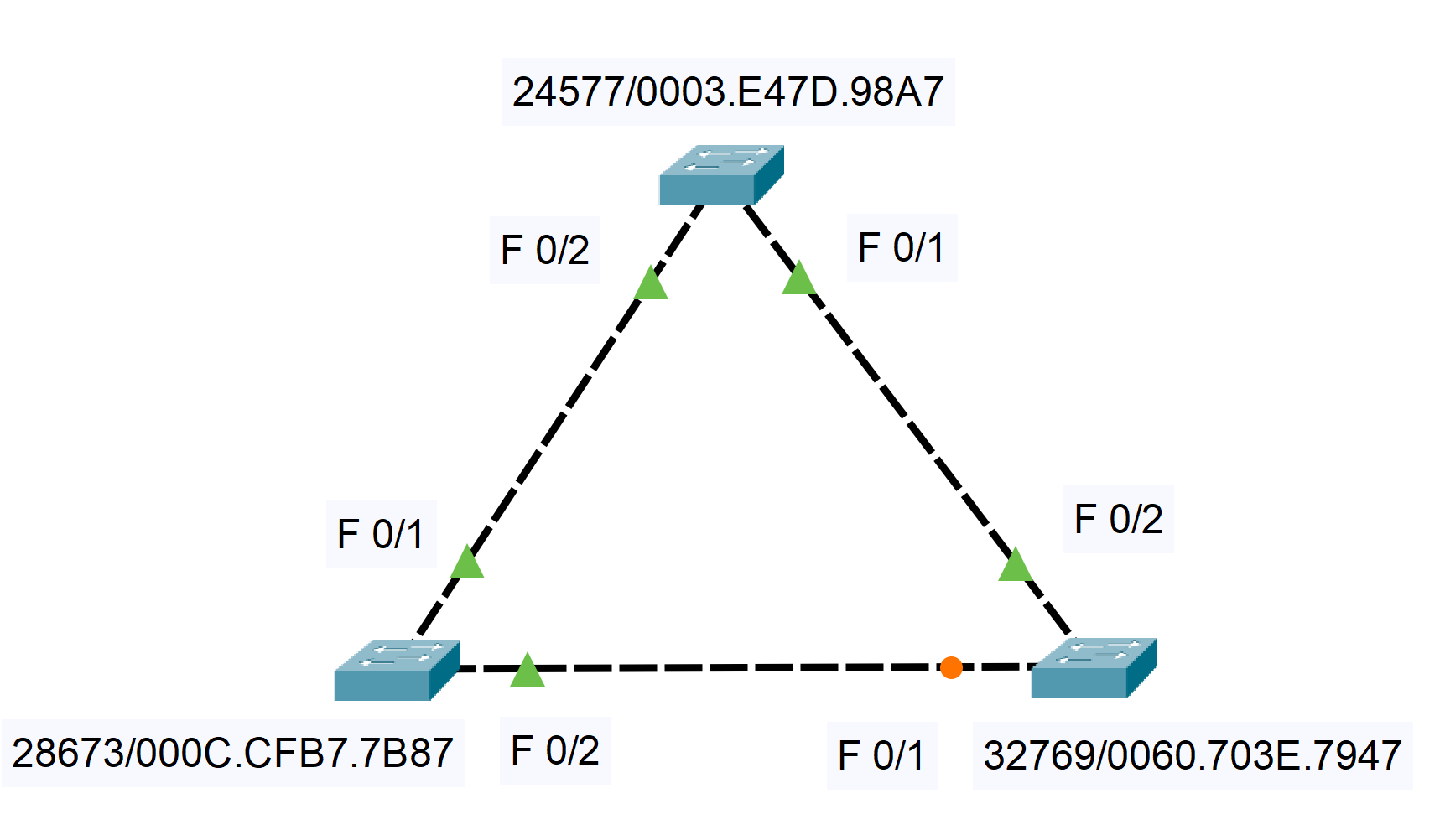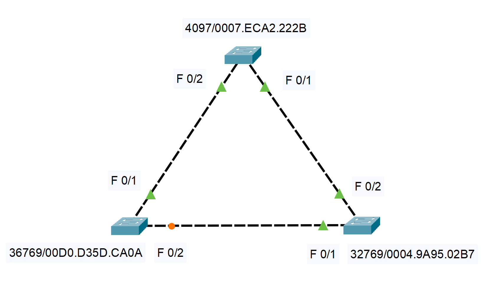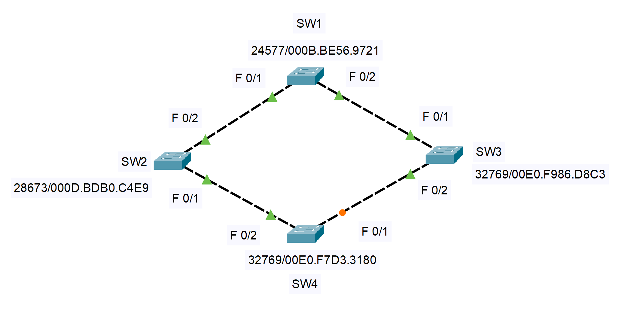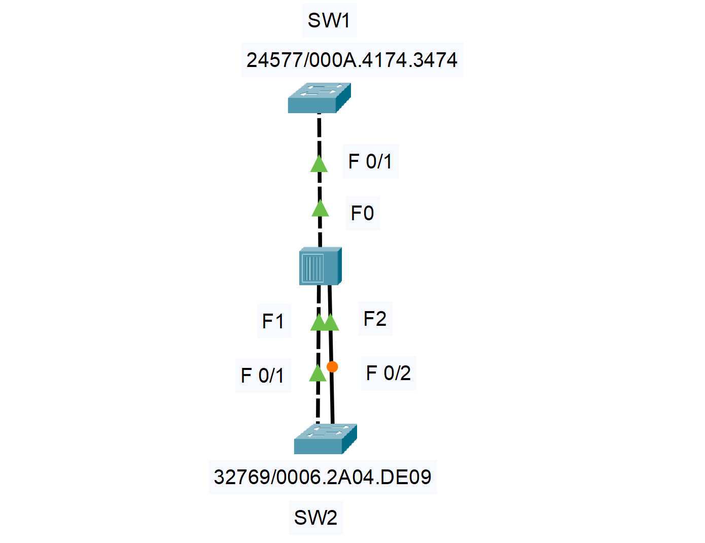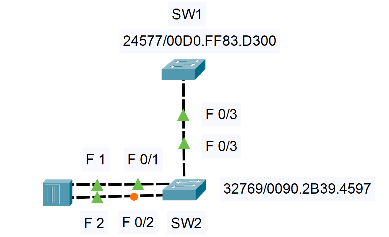 • 由于 128.1 < 128.2,F0/1 被选举为该网段的指定端口,进入转发状态。F0/2 端口进入阻塞状态。
