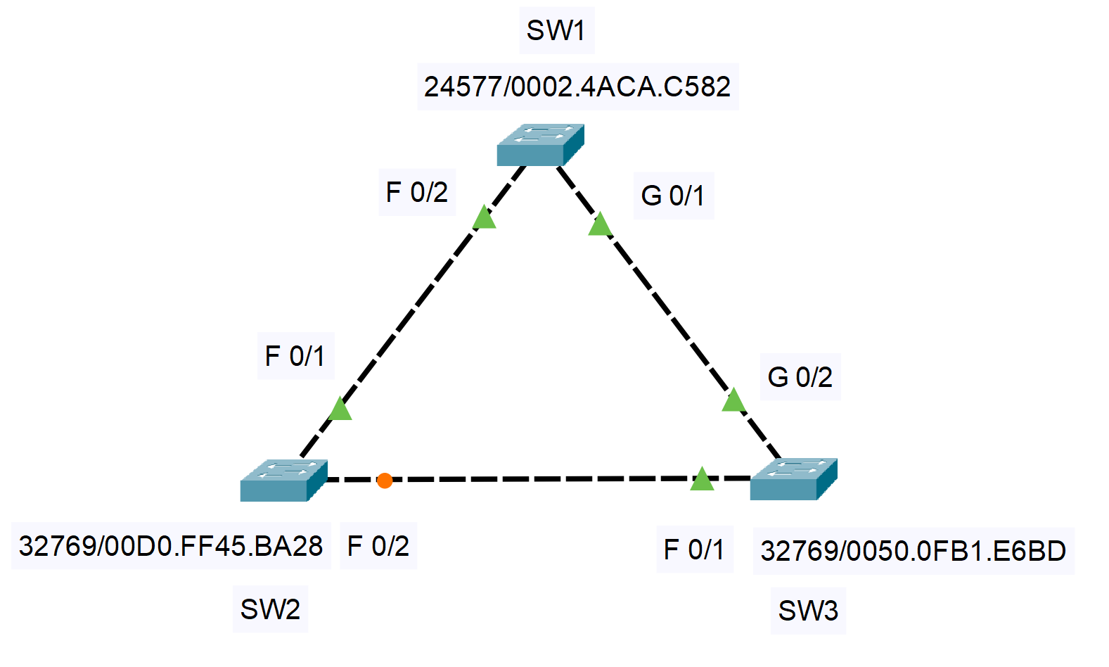 1. 按图连接交换机:SW1 F0/2 ↔︎ SW2 F0/1, SW2 F0/2 ↔︎ SW3 F0/1, SW3 G0/2 ↔︎ SW1 G0/1。